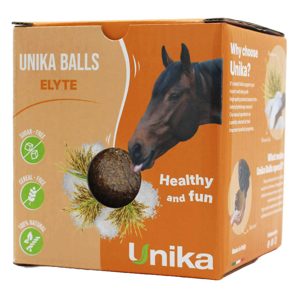 Boule Unika Balls Elyte pour chevaux : friandise saine et complément minéral 93 % végétale, favorisant récupération, équilibre et bien-être quotidien.