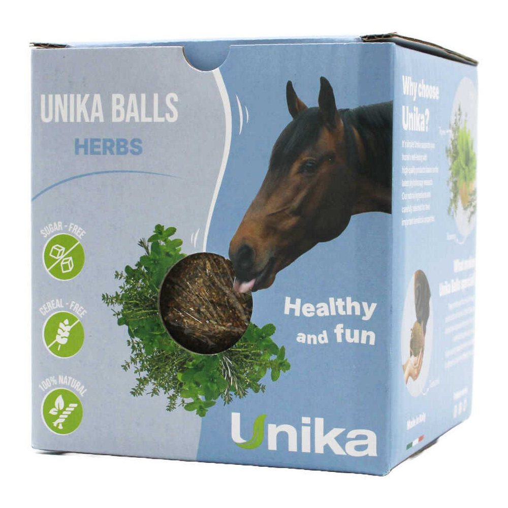 Boule Unika Balls Herbs pour chevaux : friandise à base d’herbes balsamiques, 93 % végétale, idéale pour le bien-être respiratoire et le plaisir quotidien.