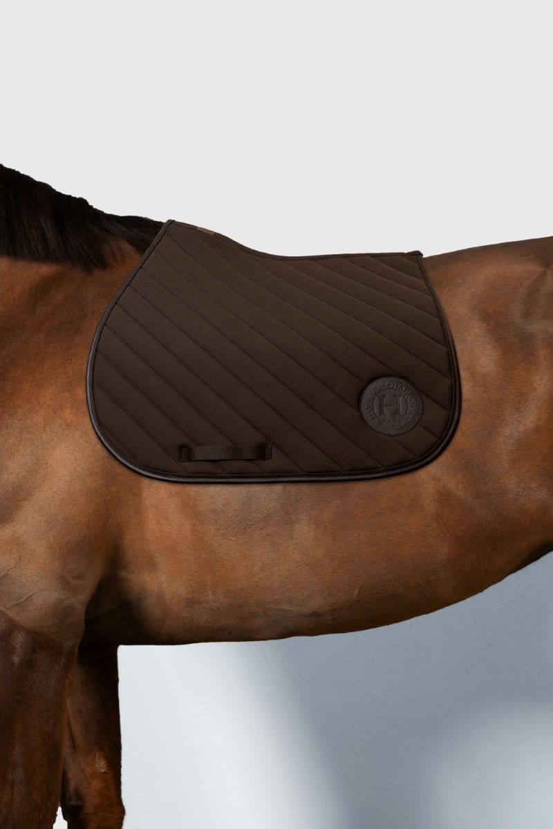 Tapis de selle Harcour élégant, confortable et respirant, avec matelassage diagonal, finitions cuir et cordon ton sur ton, adapté à toutes les morphologies de chevaux.