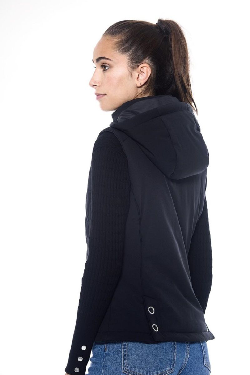 Veste sans manches femme coupe cintrée avec capuche amovible, intérieur polaire, matelassure brodée Harcour et pressions dorsales pour le confort à cheval. Taille petit.