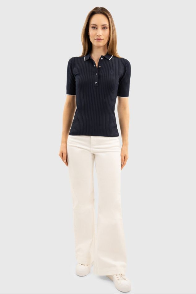 Polo manches courtes femme Harcour élégant et polyvalent, coupe ajustée, maille côtelée extensible, détails raffinés et logo brodé.