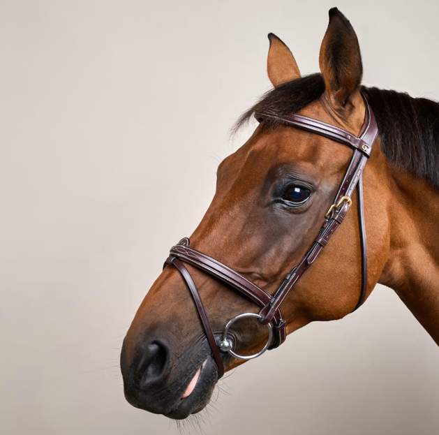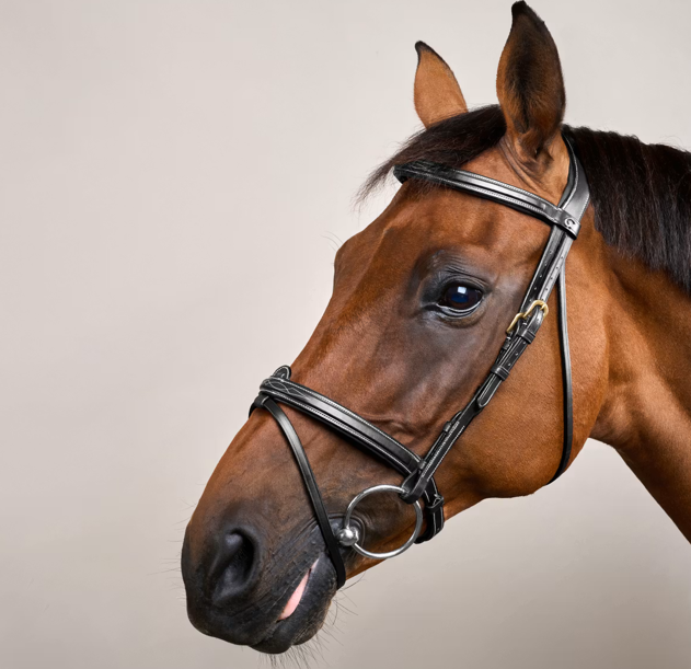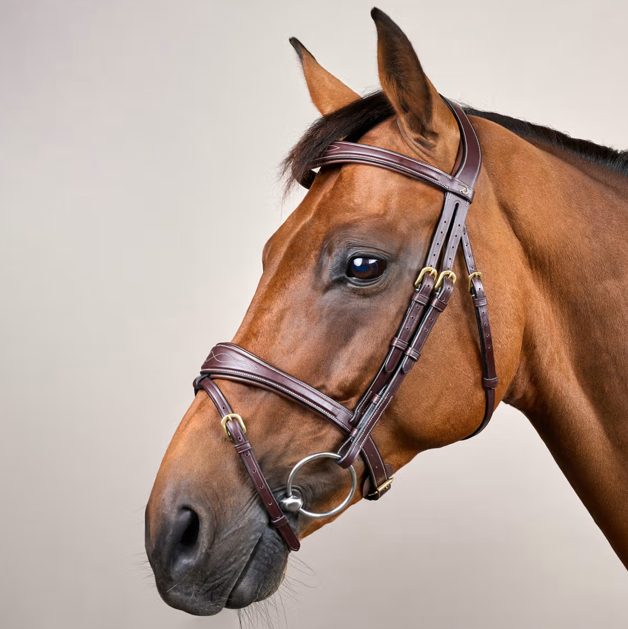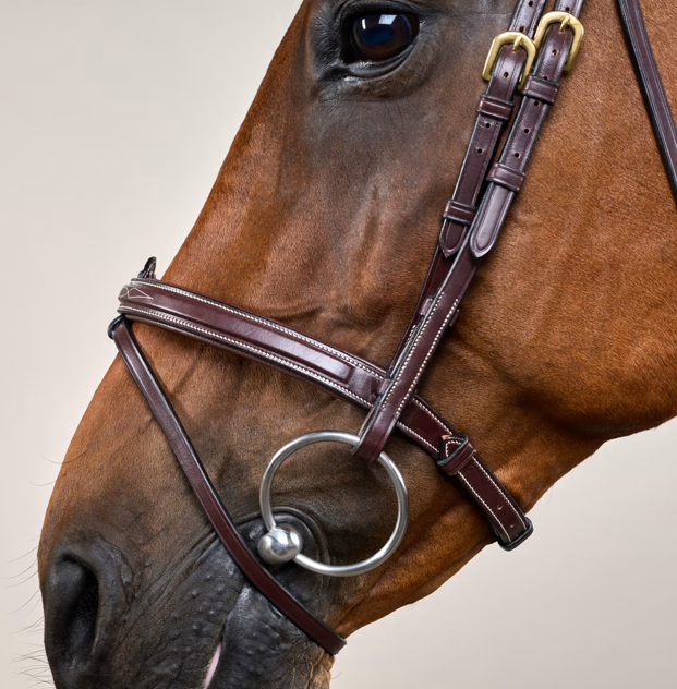 Confectionné en cuir Dy’on haut de gamme à tannage végétal, ce bridon allie durabilité et finition luxueuse. La collection D se distingue par des coutures crème et des boucles en laiton, disponible en marron et noir.