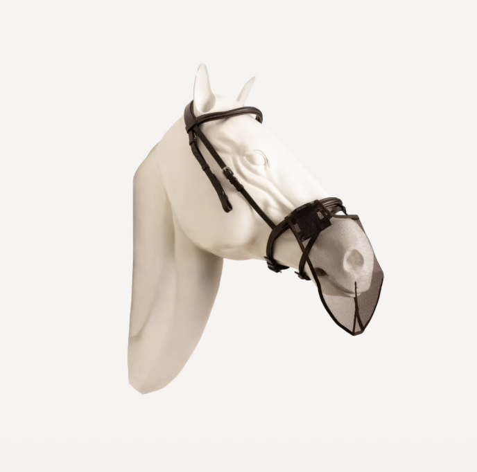 Filet de Nez Anti-mouches pour cheval : protège le nez des insectes, maille respirante et solide, forme anatomique pour un confort optimal.