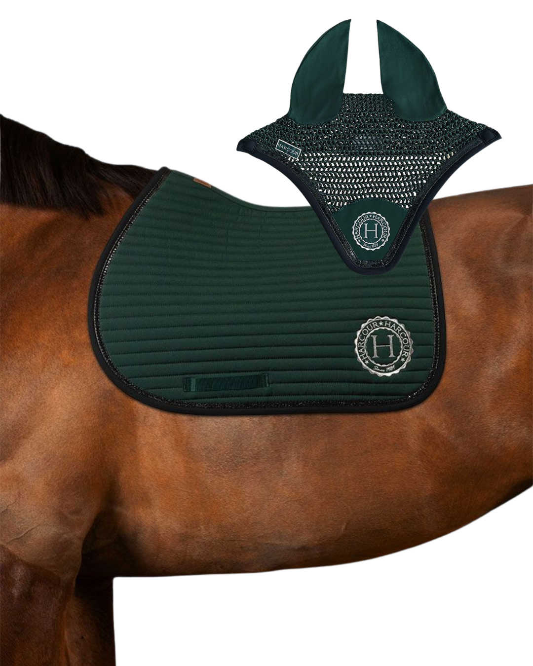 Pack Harcour Karembar/Fredy : tapis de selle stable, respirant et élégant avec bonnet assorti tricoté main. Confort, qualité et finitions soignées pour cheval et cavalier.