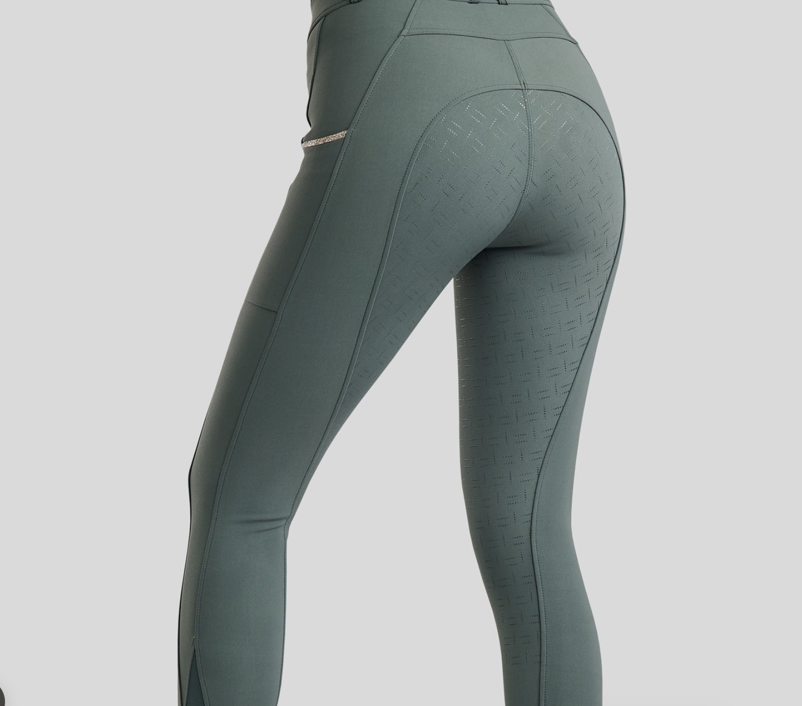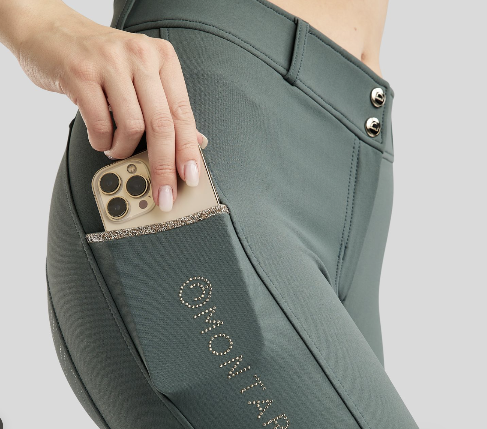Le MoLila se distingue par ses galons de cristaux couleur champagne en haut de la poche téléphone et le logo Montar en cristaux le long de la poche, pour une finition exclusive. Sa taille haute garantit un maintien parfait et met en valeur la silhouette, en selle comme à pied.