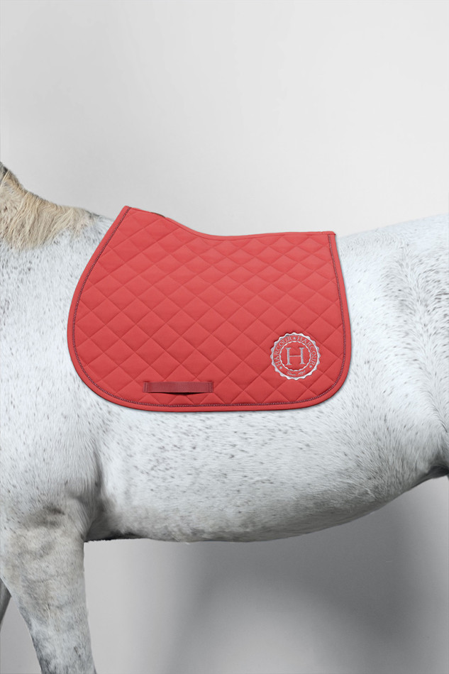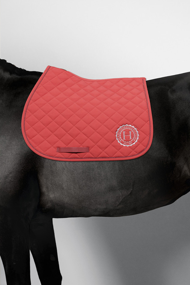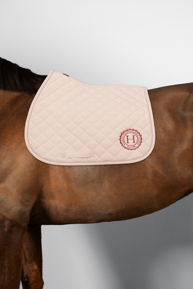 Tapis de selle Sun dégarrotté, coupe stable et coton gaufré respirant. Matelassage incliné et détails Harcour pour confort et maintien optimal.