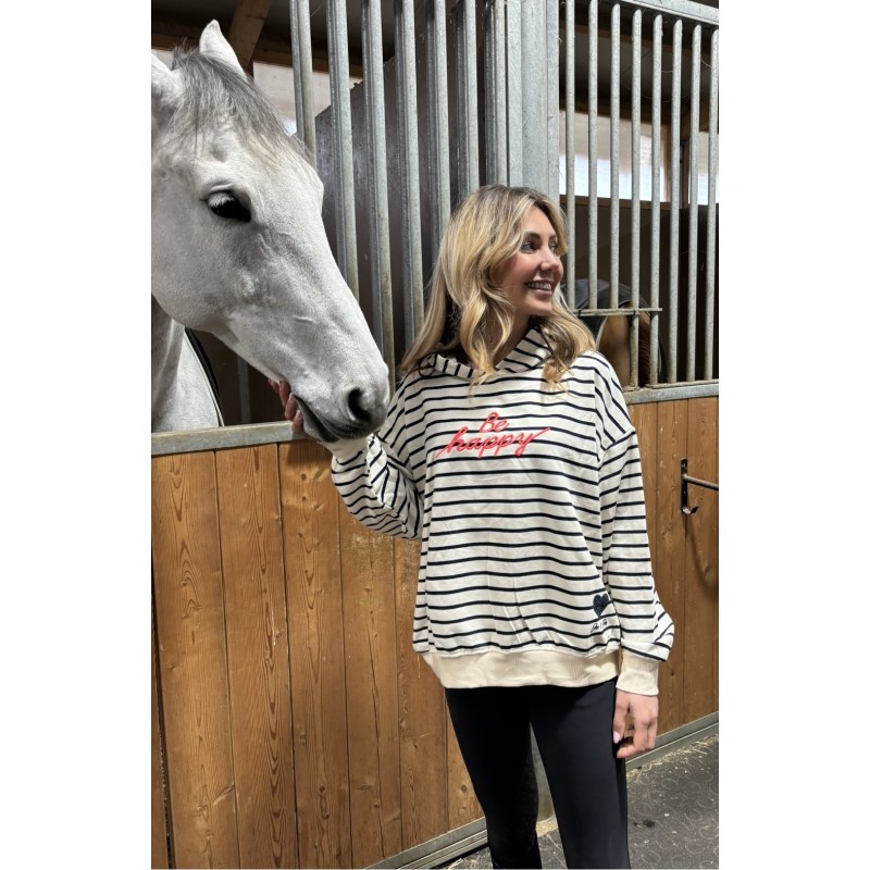 Sweat BE HAPPY Ju & Pa, confortable et tendance, disponible en rose et bleu marine. Taille unique, style rayé idéal pour les jeunes cavaliers au quotidien.