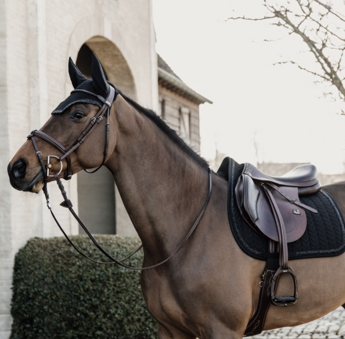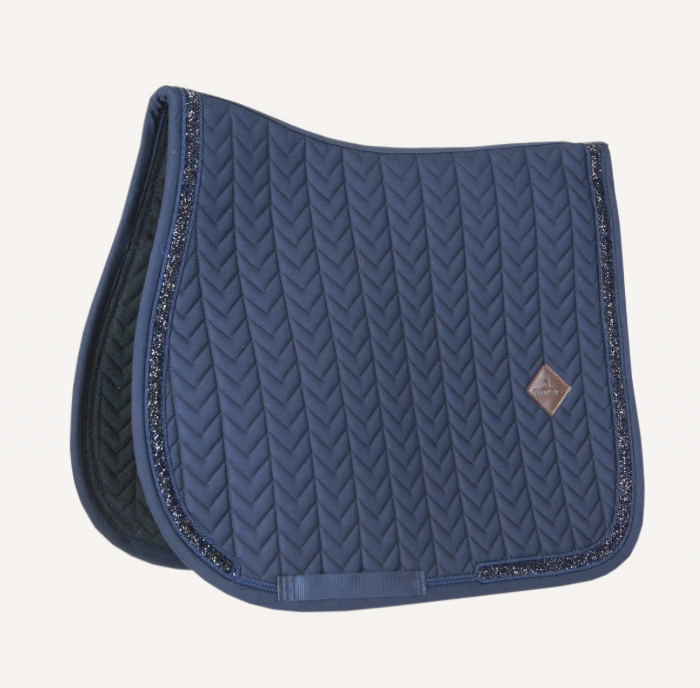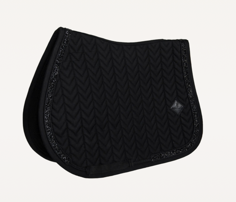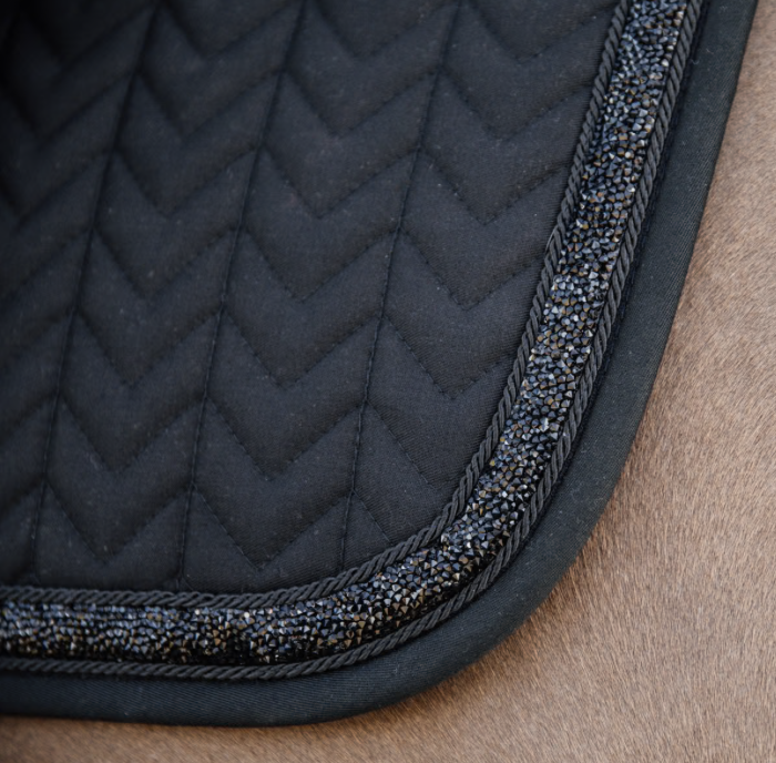 Tapis de selle Glitter Stone avec liseré en pierres scintillantes, matelassage fishbone et confort optimal pour le saut. Élégant et pratique.