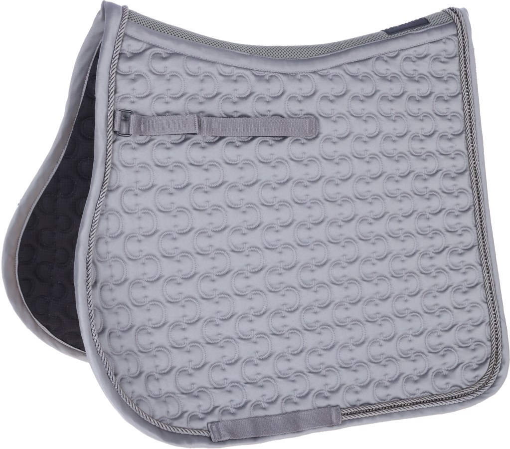 Tapis de selle Covalliero MemoryRide avec rembourrage absorbant les chocs, grip en silicone et forme anatomique. Confort optimal et maintien parfait pour le dos du cheval.