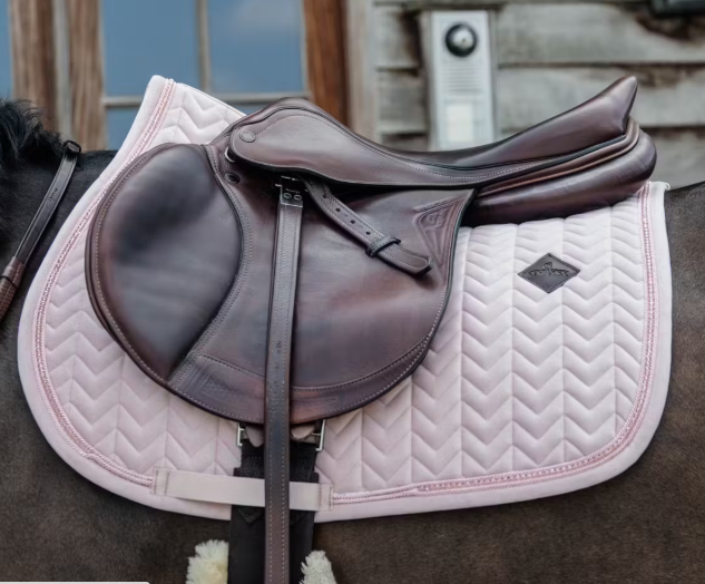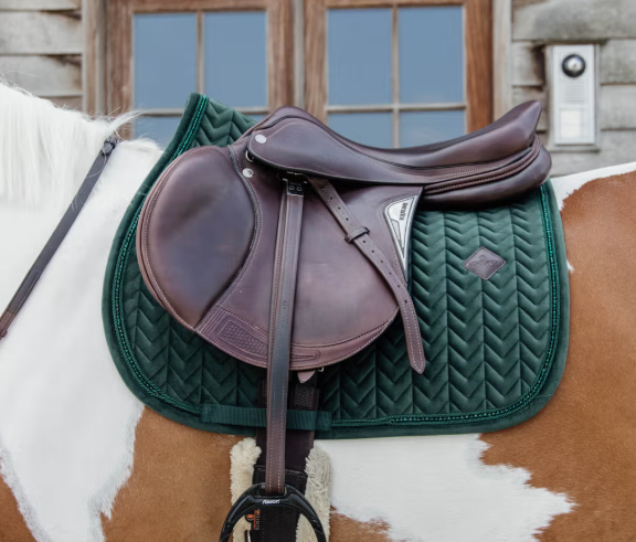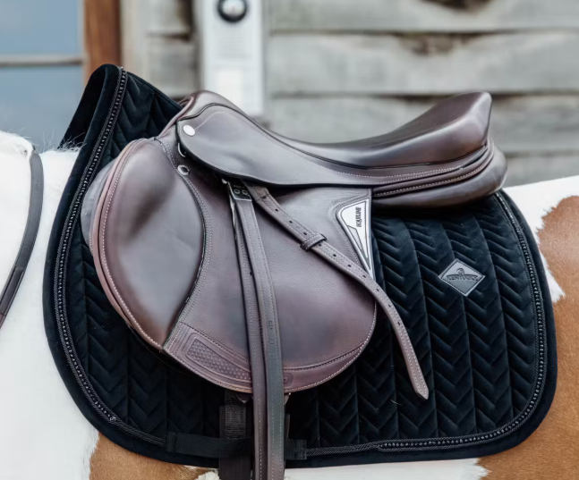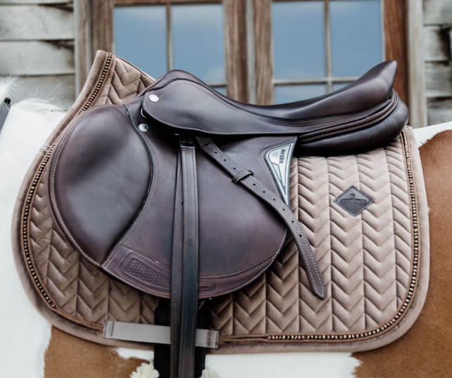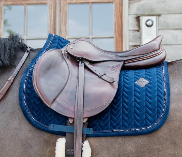 Tapis de selle Velvet Pearls en tissu velvet Fishbone avec détails en perles élégantes. Confort optimal, respirant, amortissant et facile d’entretien pour le cheval.